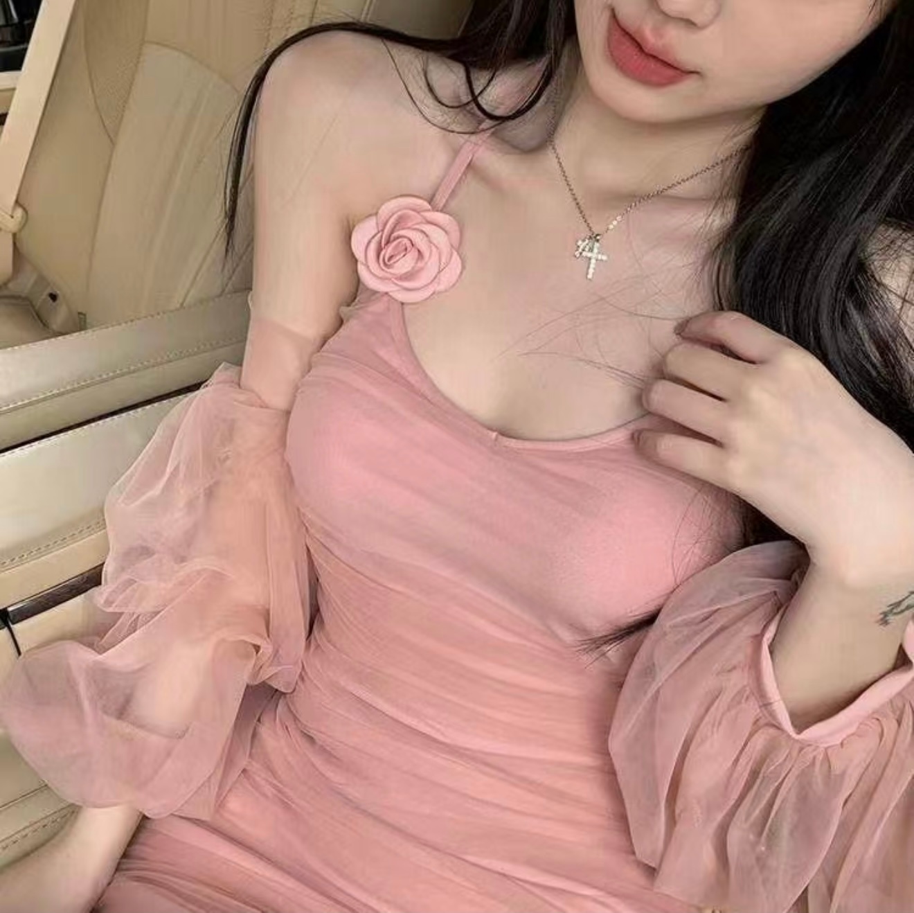 【新款】早春纯欲挂脖网纱吊带连衣裙女包臀短裙~
